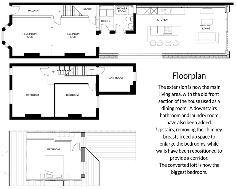 A 12m rear extension has been added to the Victorian semi and the loft converted to an extra bedroom.