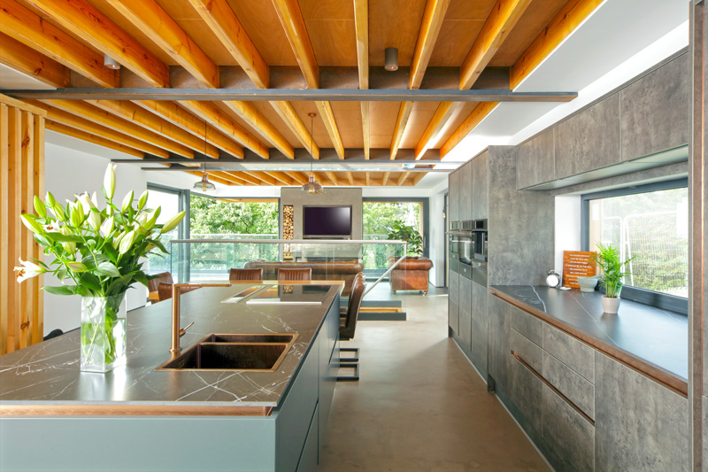 Large-format porcelain tiles create hardwearing worktops, and concrete- effect cupboard doors tie in the polished concrete floor.